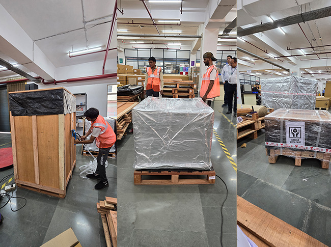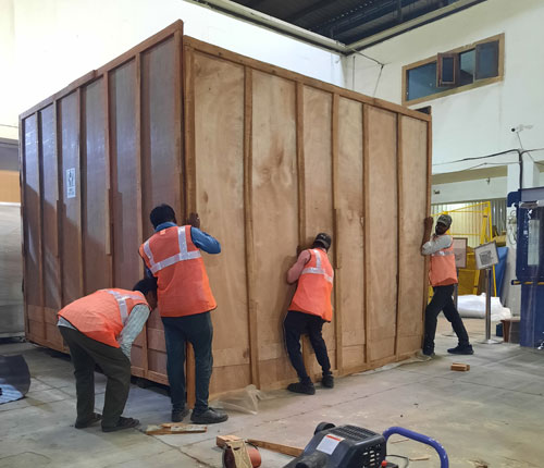 On-site crate packing with forklift and Hydra ensures safe, efficient handling and secure transportation of machinery.